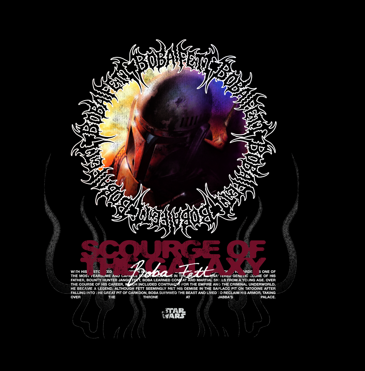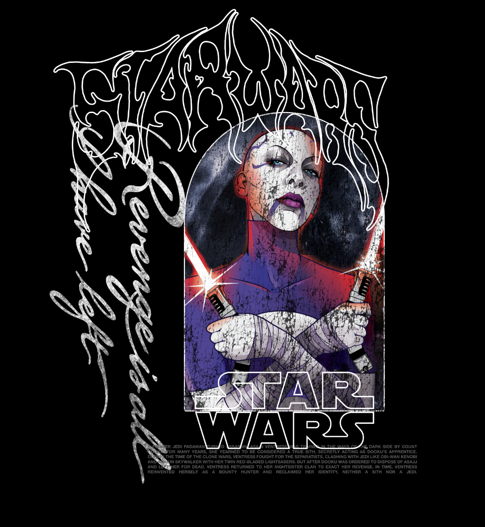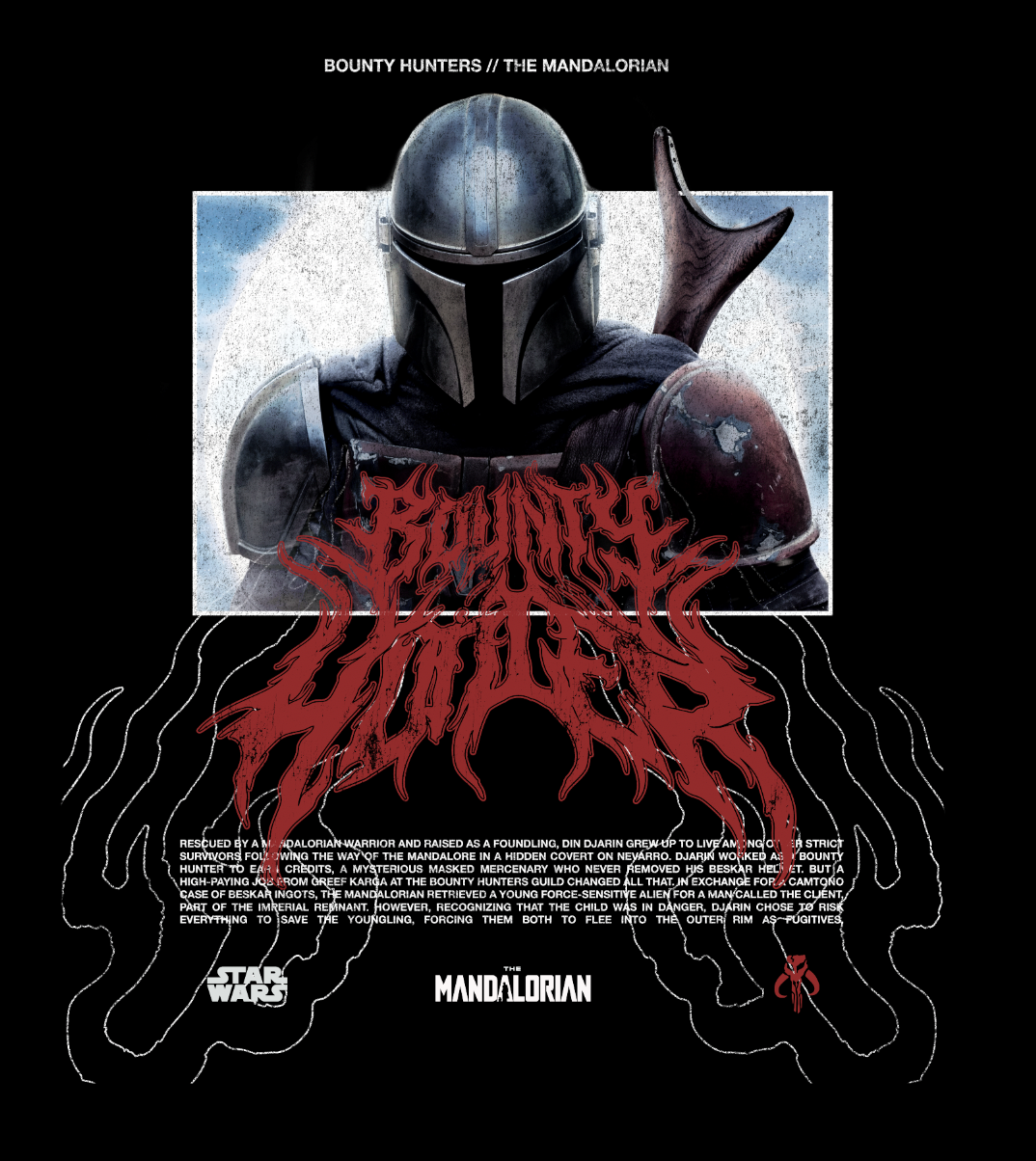 I worked on a Star Wars Bounty Hunter capsule collection for Disney Stores, where I blended the official Lucasfilm style guides with my own Civil Regime design language. The goal was to keep the characters recognizable and approved within Disney’s licensing standards while giving the graphics a heavier, more aggressive streetwear aesthetic.